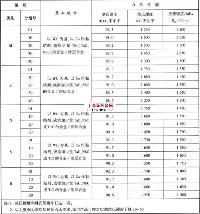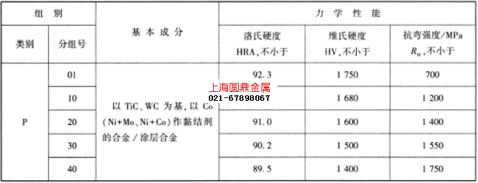 表4所列为切削工具用硬质合金各组别的基本成分及力学性能要求(摘自GB/T 18376.1-2008)。