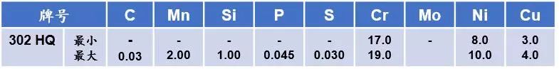 相当于或优于304不锈钢。在温热的氯化物环境中易发生点蚀和缝隙腐蚀,温度高于约50°C时对应力腐蚀开裂敏感。302HQ可耐受常温饮用水中高达约200mg/L的氯化物,如果是60℃的饮用水,可耐受的氯化物含量约为150mg/L。