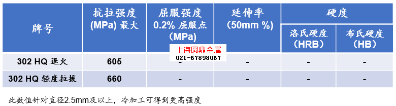 302HQ是常见的奥氏体不锈钢牌号中加工硬化率最低的牌号。抗拉强度增加约8MPa /%Ra(根据丝材拉拔数据,冷加工面积每减少1%,抗拉强度增加8MPa )。 即使在大量冷加工后,该牌号仍然基本上对磁铁没有响应。