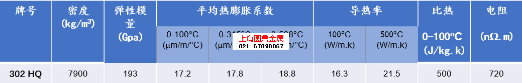 抗氧化性能良好,间歇使用温度可达到870°C,连续使用温度可达925°C。由于302HQ碳含量非常低,一般而言,在425-860°C范围内连续使用是安全的(无碳化物析出)。
