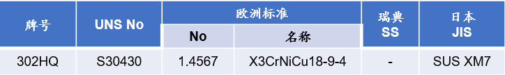 302HQ的命名是非标准化的 - ASTM规范将此牌号列为UNS S30430,这个牌号还有其它的名称包括“XM-7”,“304Cu”和“304HQ”等。 不锈钢紧固件的标准规范ISO 3506,将302HQ作为“A2”等级紧固件的合格成分; 它通常用来制造A2-70和A2-80强度等级的紧固件。 稳定的奥氏体结构使得302HQ即使在大量冷加工后也是非磁性的,并且在低至冷冻温度的条件下下仍保持优异的韧性。