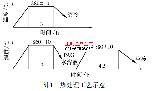 40Cr锻件接头连接件热处理工艺示意如图1所示,正火880℃保温3h空冷,调质860℃保温3h,PAG水溶液控时冷却,580℃保温4.5h出炉空冷,达到硬度要求241~286HBW。