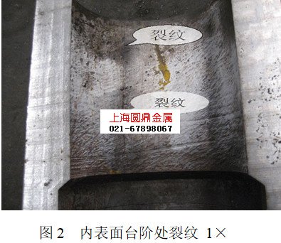 生产中有一批产品件热处理后发现30多件出现开裂,约占这批次工件的1/3。图2为开裂件锯开后肉眼看到的裂纹特征,为工件圆筒部分内表面台阶处纵向裂纹(见图2)。