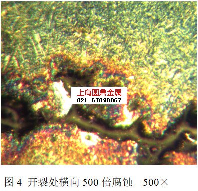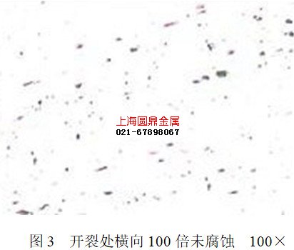 从工件的开裂部位切取纵向金相试样,经磨制抛光后先不经侵蚀在低倍视场中观察夹杂物的形状、色泽和分布情况,再用4%硝酸酒精溶液侵蚀,置于光学显微镜下观察显微组织。