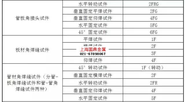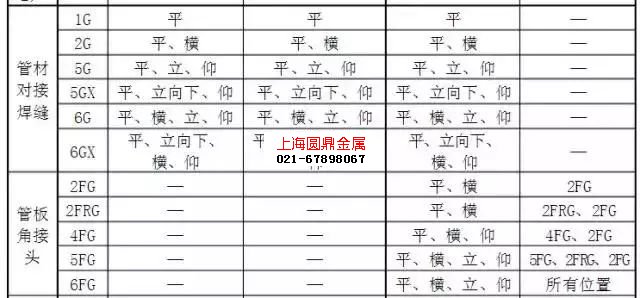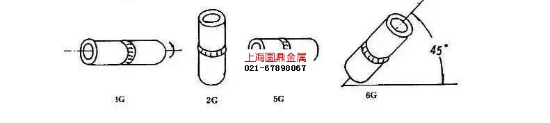(1)水平转动,代号2FRC;(2)垂直固定平焊,代号2FG;(3)垂直固定仰焊,代号4FG;(4)水平固定,代号5FG;(5)45度固定,代号6FG。