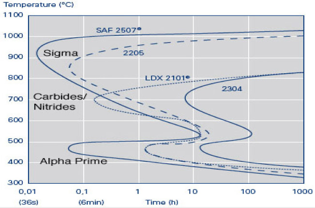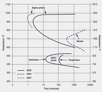 这是2205双相不锈钢等温析出曲线,1050°C (1920 ̊F) 退火 (同时给出了2304和2507双相不锈钢σ相和氮化物析出曲线作为对比)。