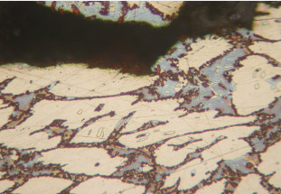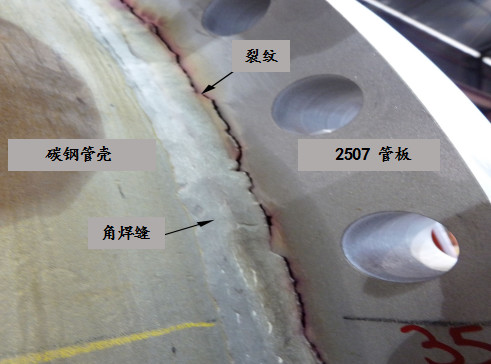 2.5 英寸厚的2507双相不锈钢管板与碳钢管壳焊接,在焊缝热影响区出现裂纹。裂纹仅在2507双相不锈钢这一侧发生, 出现在有明显σ相析出的部位,而σ相出现在2507母材上,与焊接无关。设备从未使用过。进一步调查发现,由于固溶退火水淬时喷水嘴堵塞,造成冷却不均匀,导致σ相在管板上析出。