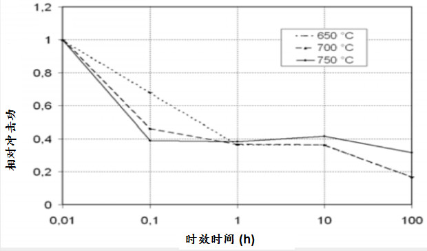 下图是 LDX 2101在不同时效温度下,室温冲击功下降的程度与时效时间的关系