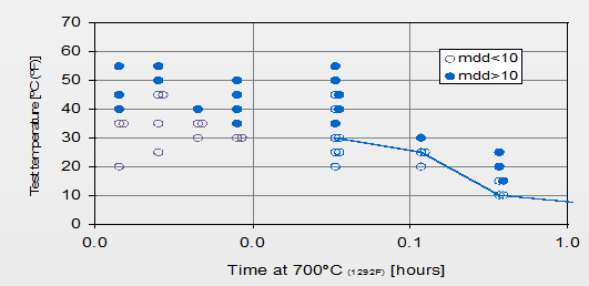 经济型双相不锈钢不容易发生σ 相和χ相等金属间相的析出,但会由于碳化物和氮化物的析出导致韧性和耐腐蚀性下降。从TTT曲线看出,LDX2101双相不锈钢在700℃较短时间就发生韧性的损失。