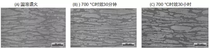 可见,发生过氮化物析出和性能损失的样品,经NaOH侵蚀后的金相组织(图B和图C) 看上去与固溶退火的金相组织非常相似,采用NaOH侵蚀的方法很难发现氮化物析出。