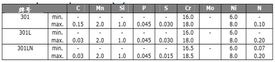 如果需要较好的延展性或要焊接厚断面型材,采用低碳的301L较好。另一个衍生牌号301LN氮含量较高,可补偿较低碳含量带来的影响。
