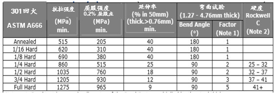 301不锈钢是具有高加工硬化率的奥氏体不锈钢,带材和钢丝抗拉强度可高达1300MPa以上,可生产1/16硬到全硬化的冷轧板。它在1/2硬化条件下可保持足够的延展性,经滚压或折弯可成形为飞机部件、建筑结构部件尤其是火车车厢构件。而3/4硬化至全硬化冷轧板应当用于要求高耐磨性能和弹性的简单部件设计。