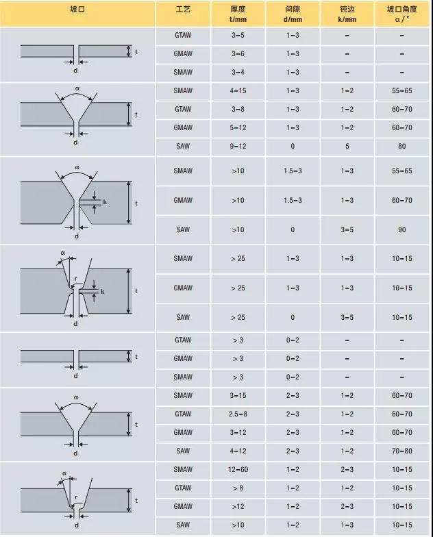 双相不锈钢的接头设计必须有助于完全焊透并避免在凝固的焊缝金属中存在未熔合的母材。最好采用机加工而不采用砂轮打磨坡口,以便使焊接区厚度或间隙均匀。必须打磨时,应特别注意坡口加工及其装配的均匀一致。为了保证完全熔合和焊透,应当去掉任何打磨毛刺。对于奥氏体不锈钢,有经验的焊工可通过控制焊炬克服坡口加工的某些缺陷。但对于双相不锈钢,这些技巧会造成材料在有害温度区间停留时间比预期的时间长,导致结果超出合格工艺要求。