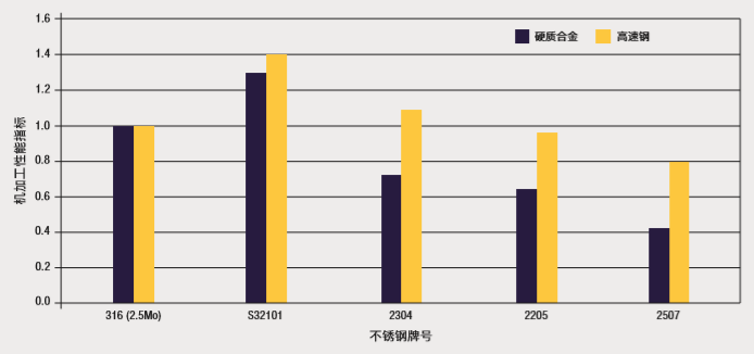 由于这些原因,双相不锈钢比具有同样耐腐蚀性的300系列奥氏体不锈钢更难进行机加工,双相不锈钢的机加工一般要求更大的切割力,并且刀具的磨损更快。当采用硬质合金刀具时,机加工的困难程度最明显。 图16给出了几种双相不锈钢和316不锈钢的相对机加工性能指标比较。注意,与316不锈钢相比,经济型双相不锈钢S32101的机加工性能等级更高。