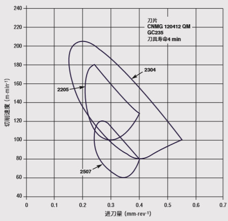 图17 采用硬质合金刀具车削双相不锈钢车削参数的比较,刀具寿命为4分钟