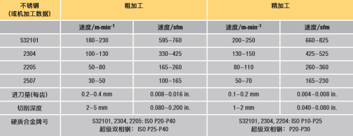 采用硬质合金刀具进行双相不锈钢端面铣削的指导原则见表13。