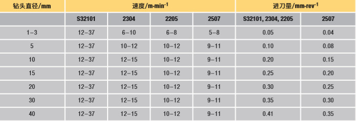 表14 双相不锈钢采用高速钢进行螺旋钻的参数 (SI制) (来源: Outokumpu)