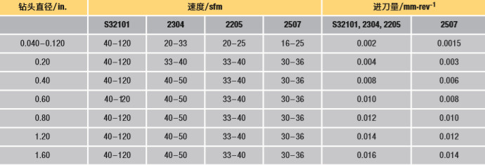 表15 双相不锈钢采用高速钢进行螺旋钻的参数(英制) (来源: Outokumpu)
