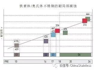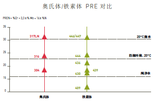由以上 PRE 对比可见,对于每一个奥氏体不锈钢牌号,都有耐腐蚀性与之相当的铁素体不锈钢牌号。