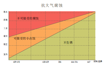 不同的环境需要不同的不锈钢牌号来抗大气腐蚀,在工业、沿海、和海水环境中,对于一些应用而言,某种程度的局部腐蚀(点蚀)也许是可被接受的