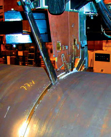 埋弧焊可用于熔敷较大焊缝,与多道次而每道次熔敷量少的焊接方法相比,它在热影响区温度范围的总停留时间较少。由于焊缝金属中铁素体相的凝固和双相组织的转变,双相不锈钢可用SAW焊接而热裂危险最小。然而为了使焊缝完全焊透,相对奥氏体不锈钢而言,有必要对接头设计和焊接参数作一些调整。SAW操作若移动速度非常快,且坡口设计不当,会导致焊缝中心线裂纹, 而降低焊接速度一般可解决裂纹问题。对于大型构件和大型直焊道的焊接,SAW是一种具有成本效益且效果较好的焊接双相不锈钢的方法。SAW常用于制造厚壁双相不锈钢管并用于带极堆焊工艺。