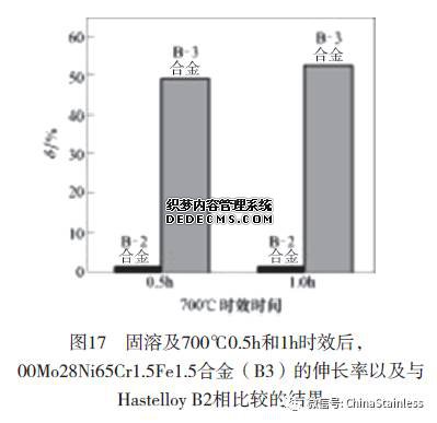 Hastelloy B-2合金是将Hastelloy B合金中的碳、硅和铁降低到较低水平的改进型牌号,B-2合金的耐晶间腐蚀性能得到改善,然而由于将铁降低到≤2%,使合金易于析出有序的Ni4Mo金属间相,造成焊接或在中温热加工出现塑性裂纹的弊病。适当地控制铁和铬,使合金的热稳定性得到明显改善, 有效地改善了合金的中温时效塑性、韧性和耐蚀性(见图16和图17,表1~3)。这些有益结果导致B-3和B-4合金的诞生,解决了Hastelloy B-2合金中温脆性和裂纹问题。