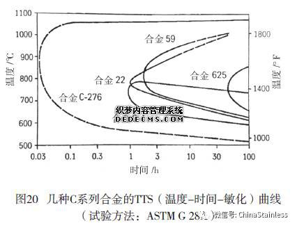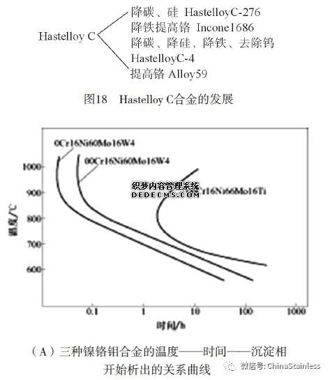 Hastelloy C合金是1930年代的合金,它具有既耐氧化性又耐还原性强介质的腐蚀,然而不幸的是它对晶间腐蚀敏感。为此在20世纪60年代至70年代经过深入研究认为是由于碳化物和金属间相的析出,造成了一些铬、钼、钨的贫化所致,据此开发了一些新牌号,其发展概貌列入图18。