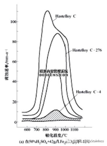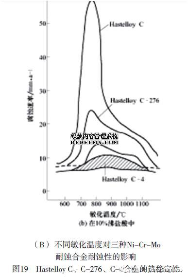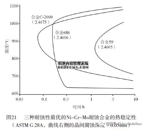 降碳、降硅仅解决了7 6 0℃敏化的晶间腐蚀,为此降铁并提高铬,既解决了870℃敏化的晶间腐蚀又进一步改善了合金的耐蚀性,Inconel686是目前耐蚀性最好的高钼镍铬钼耐蚀合金;降碳、除硅,降铁并除钨的Hastelloy C-4合金的热稳定性明显优于C-276合金,既克服了760℃敏化的晶间腐蚀又解决了870℃敏化的晶间腐蚀,然而此合金耐点蚀和缝隙腐蚀性能不如C-276合金,为此提高了合金的铬以弥补这种不足,于是诞生了Alloy 59。此合金是高钼镍铬钼合金中热稳定性最好的合金,这类合金的耐晶间腐蚀和热稳定性分别见图19~21。