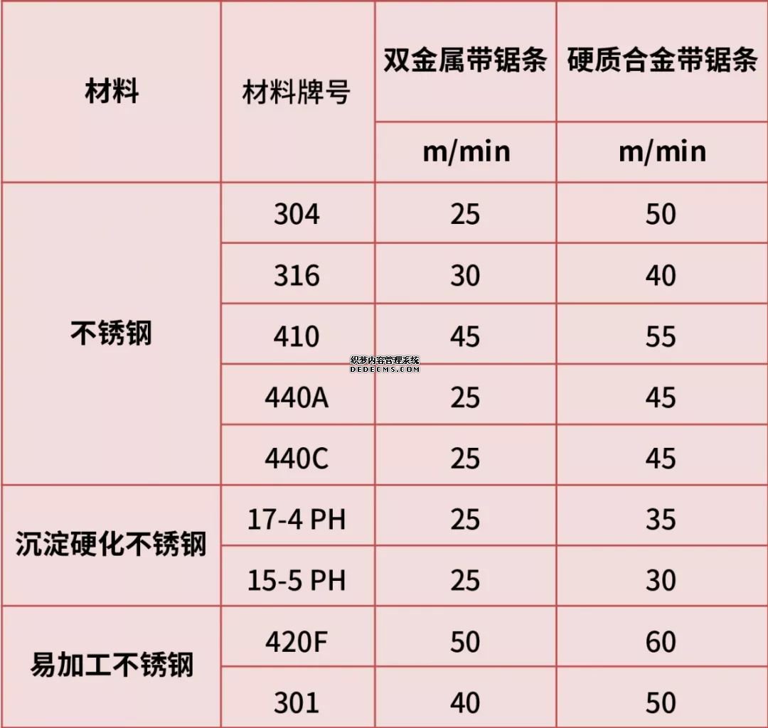 1)双金属带锯条的选择:市面上的双金属带锯条很多,粉末高速钢为齿尖的比普通M42为齿尖材料的更为耐磨。高低齿带锯条又比常规尖齿切削力更小。由于不锈钢切屑不容易断开,要适当选择前角比较大的锯条。此外还有带锯条本身的加工质量稳定性,因为带锯条不同于其他刀具,其背部的热处理状况和齿尖背材的机加工状况会对切削性能有很大的影响。